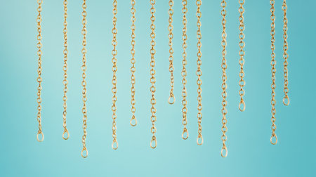 A captivating collection of vertical gold chains gracefully hanging against a soft blue background, ideal for creative projects in fashion and jewelry.
