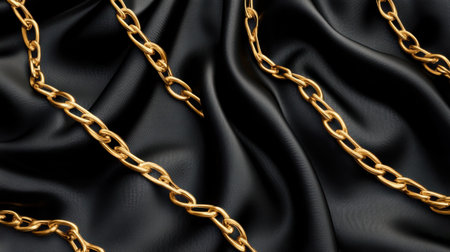 This striking image features golden chains artistically laid over a rich black fabric. The contrast highlights luxury, elegance, and artistic style, perfect for various design projects.