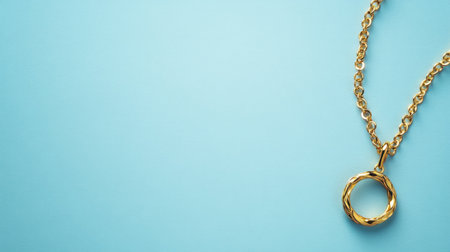 This image features an elegant gold necklace with a round pendant, perfectly styled against a soft blue background, ideal for jewelry and fashion themes.
