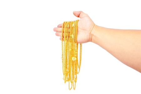 gold pendants in hand on white background