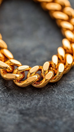 A stunning close-up image of a shiny gold chain necklace resting on a dark surface, emphasizing its luxurious texture and fine craftsmanship, ideal for fashion-related projects.