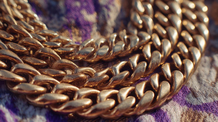 This image showcases a stunning close-up of a luxurious golden chain necklace, highlighting its shiny links and intricate design. The reflective surface under natural light enhances its beauty.