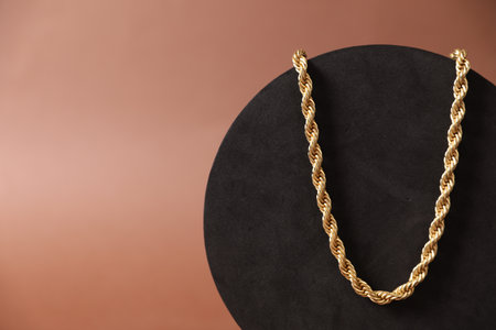 Beautiful gold necklace on brown background, closeup. Space for text