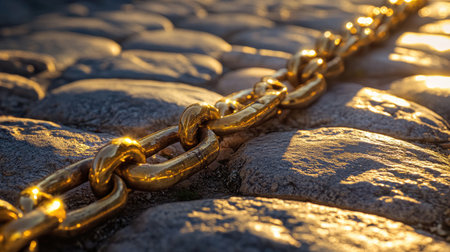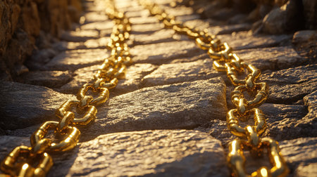 A captivating image showing glimmering golden chains laid across a rugged stone pathway, illuminated by the warm glow of sunset light to create a striking visual effect.