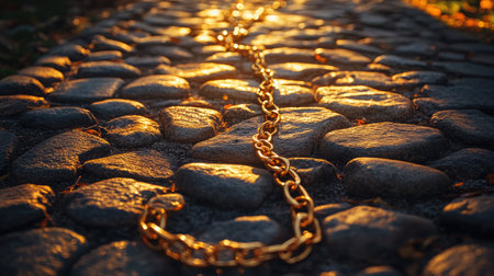 A shimmering gold chain lies across a cobblestone pathway, illuminated by warm sunset light, creating a tranquil and visually captivating scene.