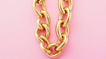 This image showcases a stunning shiny gold chain necklace against a pastel pink background. The sleek design exemplifies modern luxury and elegance, making it a perfect fashion accessory.
