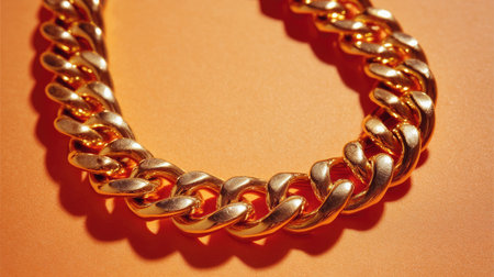 A close-up view of a luxurious gold chain necklace set against a vibrant orange background, highlighting its polished shine and elegant design as a fashionable accessory.