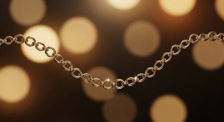 A detailed view of a golden braided chain showcases its intricate design and shimmering reflections. The warm light enhances the beauty and texture of the metallic surface.