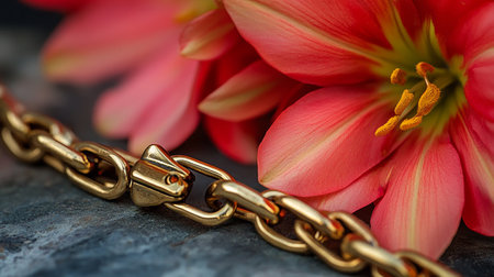 Close up of golden chain and pink lily flower on rustic background