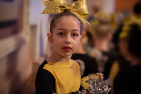 Cheerleader. cheerleader girl of 9 years in anticipation of a sports performance. The girl is a sporewoman.A child worries before going on stage for a cheerleading or acrobatics competition.Gymnastics