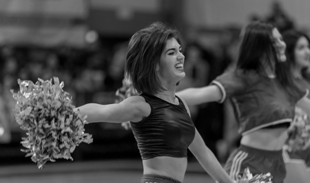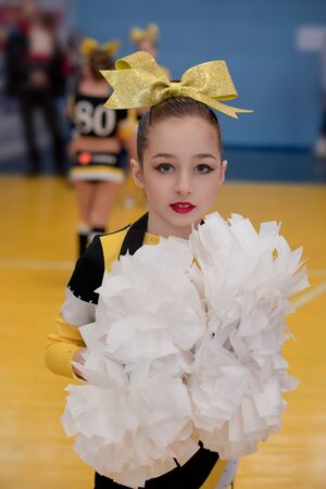 Odessa, Ukraine - Febr 16, 2019: Bright dynamic characteristics of a support group of women's sports team. Performance Support Group. Bright beautiful young girl in sports dance form on the playground