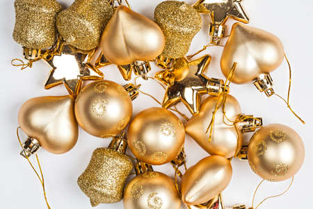 Christmas golden collection, balls and decorative ornaments, on white wooden background.