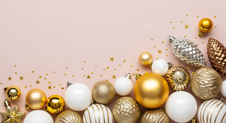 A festive arrangement of gold, white, and silver Christmas ornaments and star confetti is scattered along the right and bottom edges of a light pink background. The collection includes various sizes and textures of baubles, pinecone-shaped ornaments, and scattered gold star confetti, creating a celebratory and elegant holiday border with ample copy space.