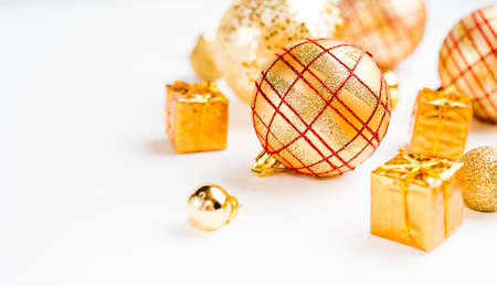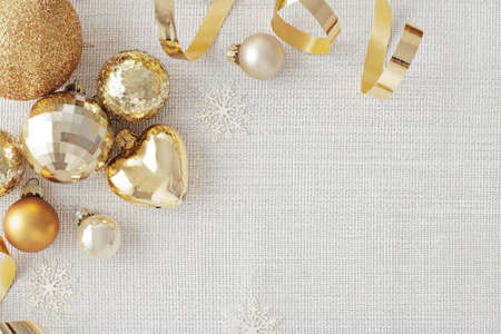 Christmas background with golden and white decorations. Christmas greeting card. Selective focus.