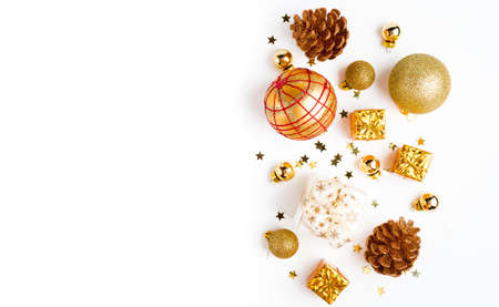A festive arrangement of golden Christmas ornaments, gift boxes, pinecones, and ribbons on a clean white surface, evoking holiday cheer.