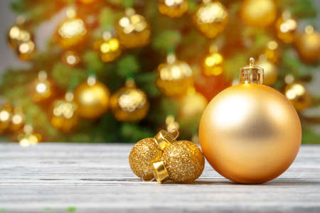Christmas baubles on wooden table against decorated christmas tree blurred background