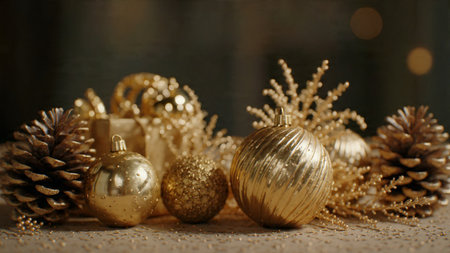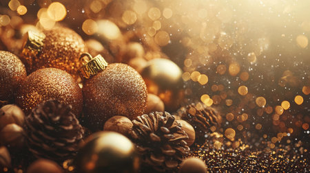 A close-up of festive golden Christmas ornaments and pinecones with sparkling glitter and warm lights, perfect for holiday celebrations.