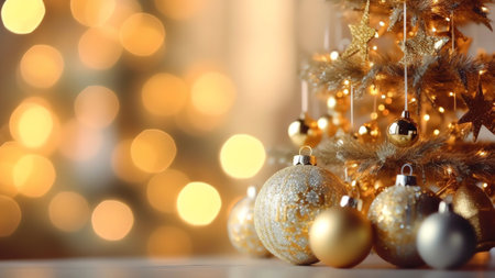 Generative AI : Christmas tree decorated with Golden balls toys on a blurred gold sparkling and fabulous fairy background with beautiful bokeh copy space