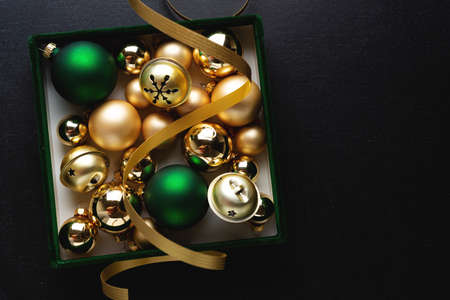 Christmas deco box with baubles on dark background. Flat Lay. Christmas concept