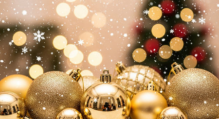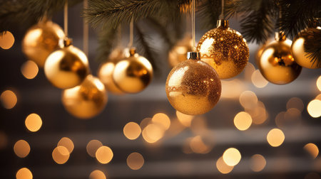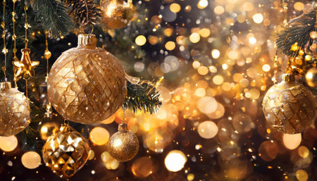 Various golden and transparent Christmas ornaments with decorative ribbons are displayed. The scene includes detailed textures and a blurred background creating a soft, warm ambiance. Suitable for a variety of holiday themed commercial and editorial projects.