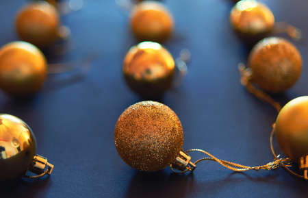 Close up composition with christmas golden balls on a black background. Shallow DOF. Happy new year wallpaper.