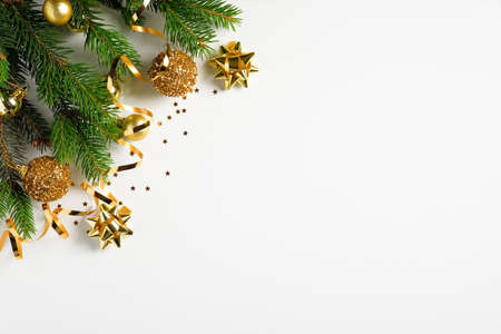 Christmas banner mockup. Fir tree branch decorated golden balls and ribbon on white background with copy space. Xmas greeting card, postcard template