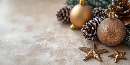 A Christmas scene with a star, two gold ornaments, and pinecones. The scene is set on a beige background