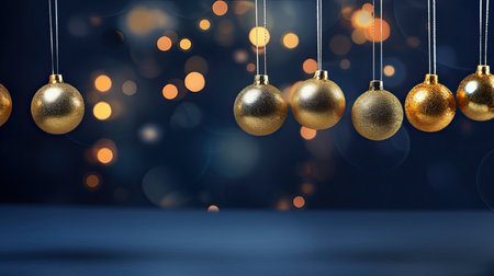 This visually stunning minimalistic background captures the essence of Christmas and New Year celebrations, showcasing elegant golden and blue glass balls gracefully hanging on ribbons, creating