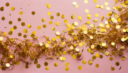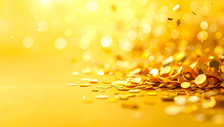A close up of golden confetti falling through soft lighting, creating celebratory and vibrant atmosphere against blurred background