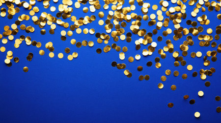 Gold glitter and confetti pattern on the left on a blue background. Copy space. Empty background with glitter and space for text.
