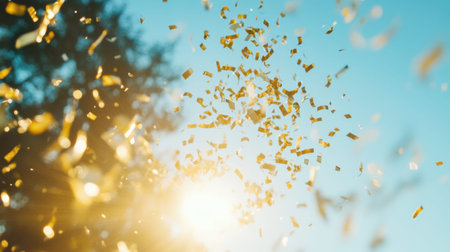 This vibrant image captures golden confetti falling gracefully from the sky, illuminated by sunlight. It evokes a sense of celebration and joy, perfect for festive occasions.