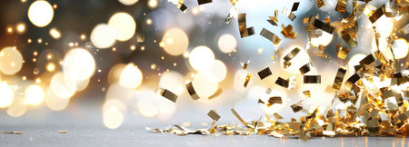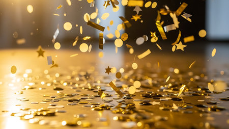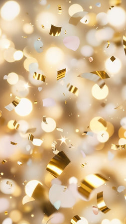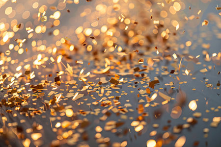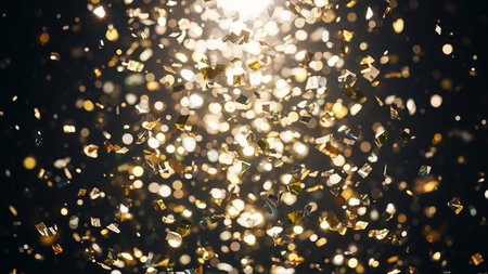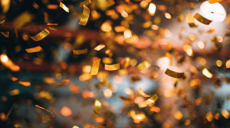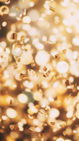 Celebration showing golden confetti and glitter falling and sparkling in warm light creating a magical and celebratory atmosphere with bokeh effects keywords:...