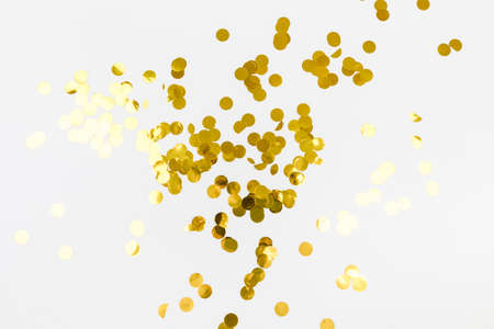 Golden confetti on a white background. The concept of a holiday, party, birthday, decoration. Banner Flat lay, top view.