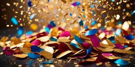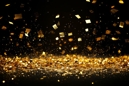 Vibrant showing abundant golden confetti and sparkling bokeh lights raining down against a dark background creating a vibrant and celebratory mood for special...