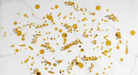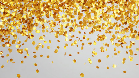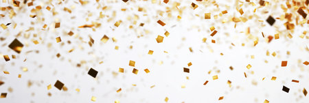 A vibrant image capturing a multitude of golden confetti pieces scattered in mid-air. The confetti appears to be floating against a bright, white background, creating a festive and celebratory atmosphere. The golden confetti pieces are of varying sizes, adding depth and texture to the scene.