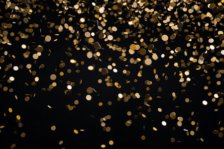 Captivating scene of golden confetti falling gracefully through the air, creating a festive atmosphere filled with bright bokeh lights and sparkling joy.