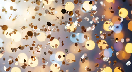 Bright showing a cascade of golden silver and iridescent confetti including stars and circles falling downwards against a soft bokeh background of warm yellow...