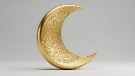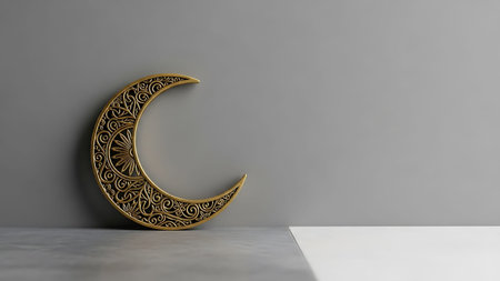 A gold crescent moon with islamic patterns stands on a gray surface, symbolizing ramadhan festivities in a minimalist setting.