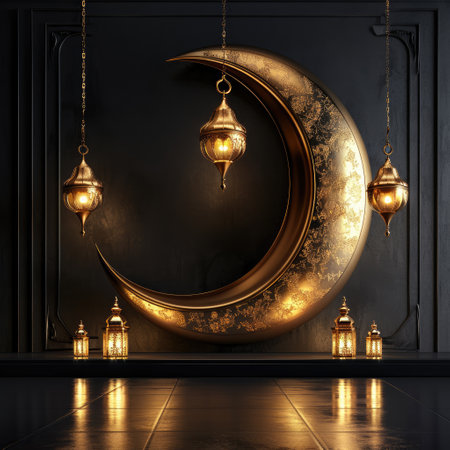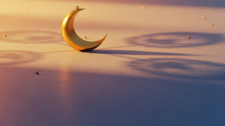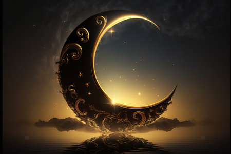 3D rendering of a golden crescent moon on a colorful background with glittering bokeh, a concept for the Ramadan Islamic festival and night. --chaos 30 --ar 16:9 --v 6.1 Job ID: 848e618d-d9ba-40b1-91ea-d5be74620941