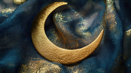 A beautiful golden crescent moon rests gracefully on textured blue fabric, creating a serene and elegant atmosphere perfect for artistic projects.