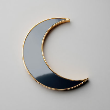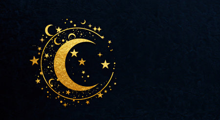 This striking image features an elegant crescent adorned with intricate gold patterns and soft blue flowers, creating a serene and stylish mood perfect for seasonal themes.