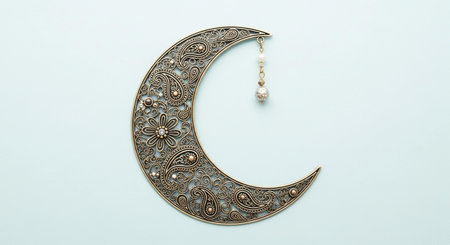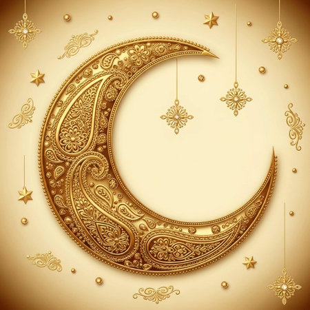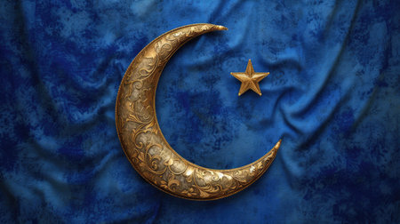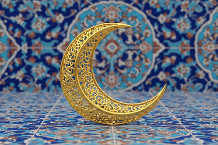 Golden crescent moon resting on an ornate Turkish patterned surface, with geometric arabesque and floral motifs, perfect for Eid decorations.