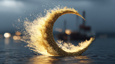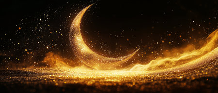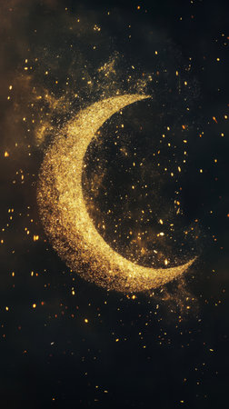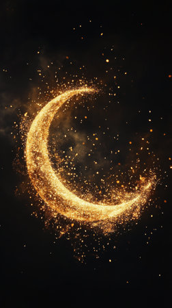 A vibrant crescent moon created from shimmering golden particles illuminates a dark backdrop. The glowing effect suggests a magical or dreamlike ambiance, enhancing the visual appeal.