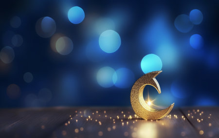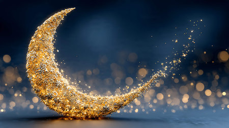 A glittering golden crescent moon decoration, sits on a sparkling surface. Festive lights bokeh in the background.