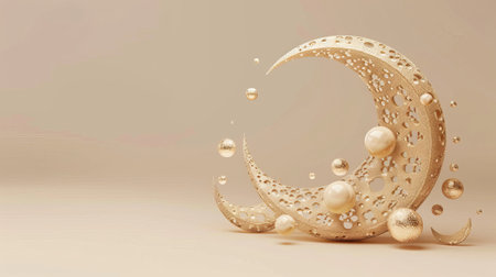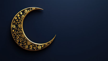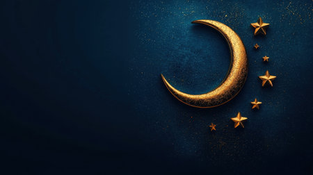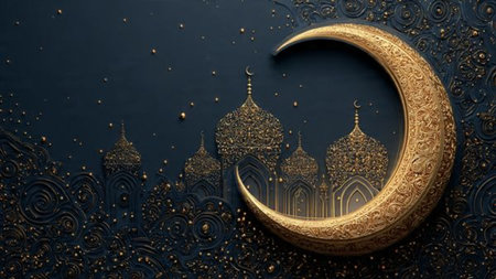 Elegant golden crescent moon with Islamic geometric patterns on a dark blue background, a banner design for the Ramadan Kareem celebration. 3D rendering illustration of an abstract Muslim pattern symbolizing the holy month and the Ramadan holiday concept. Stock photo with 2/3 space for text. --chaos 30 --ar 16:9 --v 6.1 Job ID: afecbcc5-5607-4ec8-a896-2664497ac960