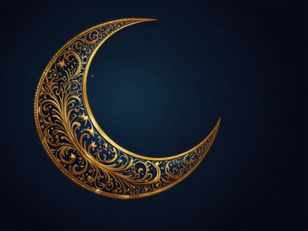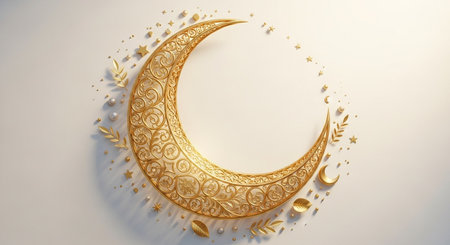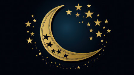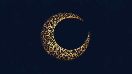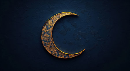 3D rendering of a crescent moon with an Islamic pattern on a dark blue background for an Eid Mubarak and Ramadan Kareem greeting card template design, banner, poster, or presentation. Isolated vector illustration. Blue background with a golden moon symbol in the middle. Ramadan concept. Vector illustration. Wide-angle lens, shot from above, warm lighting, ultra-realistic photography. --chaos 30 --ar 16:9 --v 6.1 Job ID: b29434b1-8191-46ec-ad2c-153422e20f30