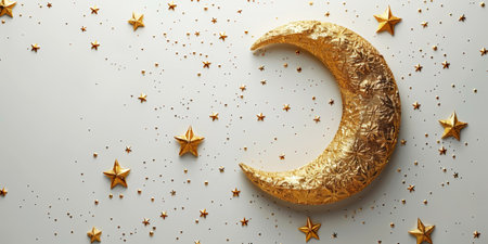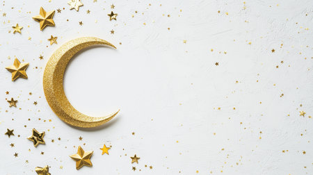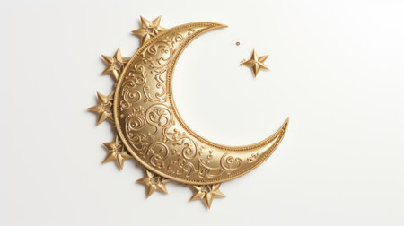 Golden crescent moon and stars on a white background, ideal for festive or celebratory designs. Islamic New Year. With Generative AI technology.