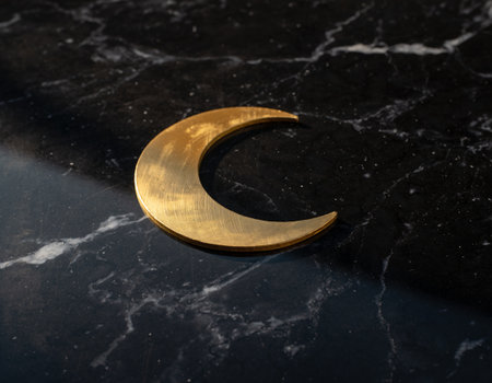Golden crescent moon on black marble background. Ramadan Kareem concept.