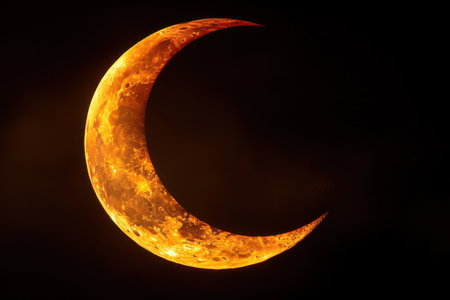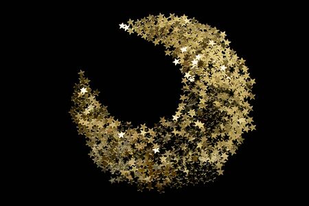 The golden crescent moon is illuminating the night sky against a black background. It shines brightly as a symbol of the mysterious beauty of astronomical objects