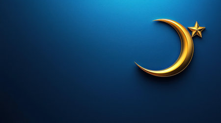 Minimalist golden crescent and star against a deep blue background, elegant Ramadan theme.